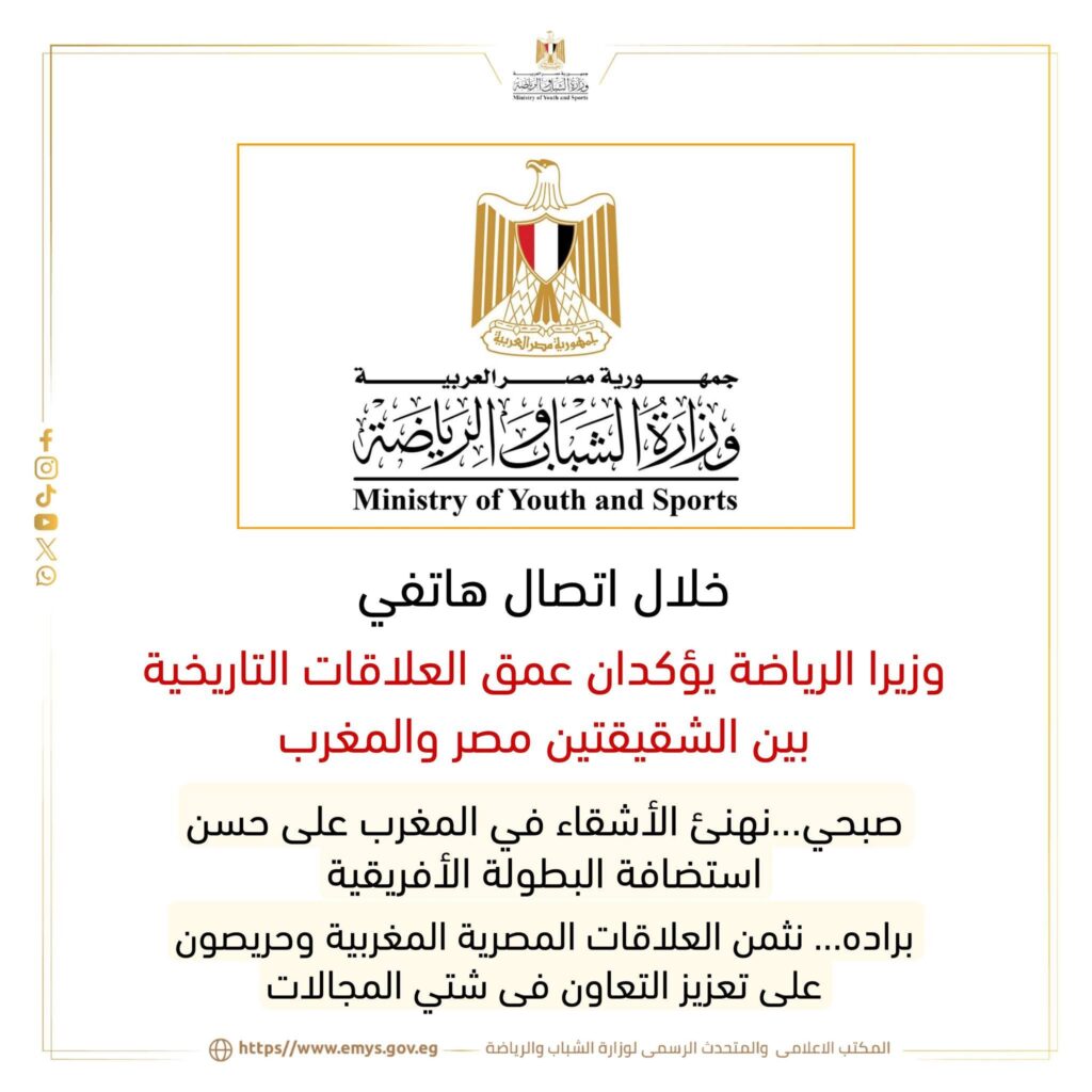 أكد الوزيران الدكتور أشرف صبحي، وزير الشباب والرياضة ومحمد سعد برادة، وزير التربية الوطنية والتعليم الأولي والرياضة بالمملكة المغربية، خلال اتصال هاتفي، عمق العلاقات التاريخية والأخوية التي تجمع بين مصر والمغرب، والتي تمتد عبر عقود طويلة من التعاون والتكامل في مختلف المجالات، وعلى رأسها المجالان الرياضي والشبابي، مشددين على أن المنافسة الرياضية يجب أن تظل في إطارها الحضاري القائم على الاحترام المتبادل والروح الرياضية.