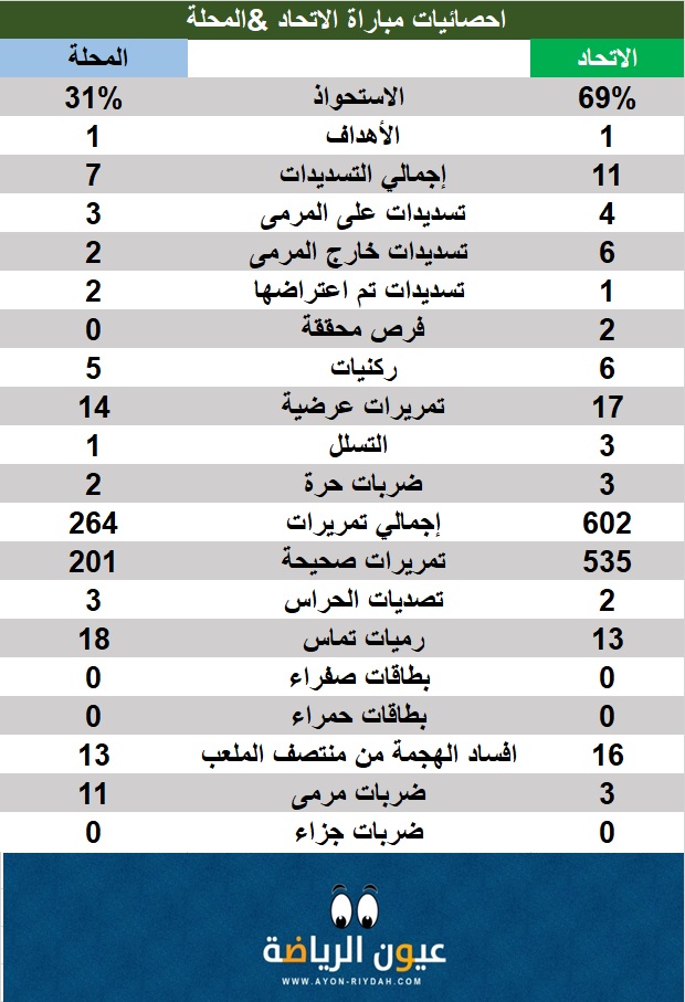 كما عودنا متابعينا بموقعنا الاليكتروني وصفحتنا بالتواصل الاجتماعي فيسبوك ” عيون الرياضة ” لعمل إحصائيات شاملة للمباراة من حيث الأداء والتسديدات والتمرير ويعقبها درجات للاعبين في المباراة ويلاحظ ان المباراة شهدت استحواذ بنسبة كبيرة من لاعبي الاتحاد والأداء في الشوط الثاني اختلف وكان جدي على المرمى وقد افتقد الفريق لكثير من المقومات الفنية خلال الشوط الأول وظهر اكثر من لاعب بعيد عن مستواه كما ظهر لاعبون بمستوى مرتفع وبعد تسجيل هدف التعادل اكتفى الفريق بالهدف واصبح اللعب وسط الملعب بشكل ملفت للنظر من اللاعبين