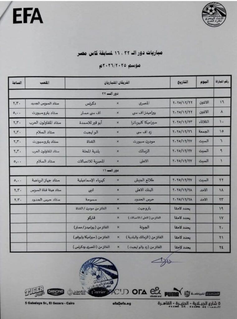 أعلنت إدارة المسابقات بالاتحاد المصري لكرة القدم عن تحديد مواعيد المباريات المتبقية من منافسات دور الـ 32 لبطولة كأس مصر لموسم 2025/2026.