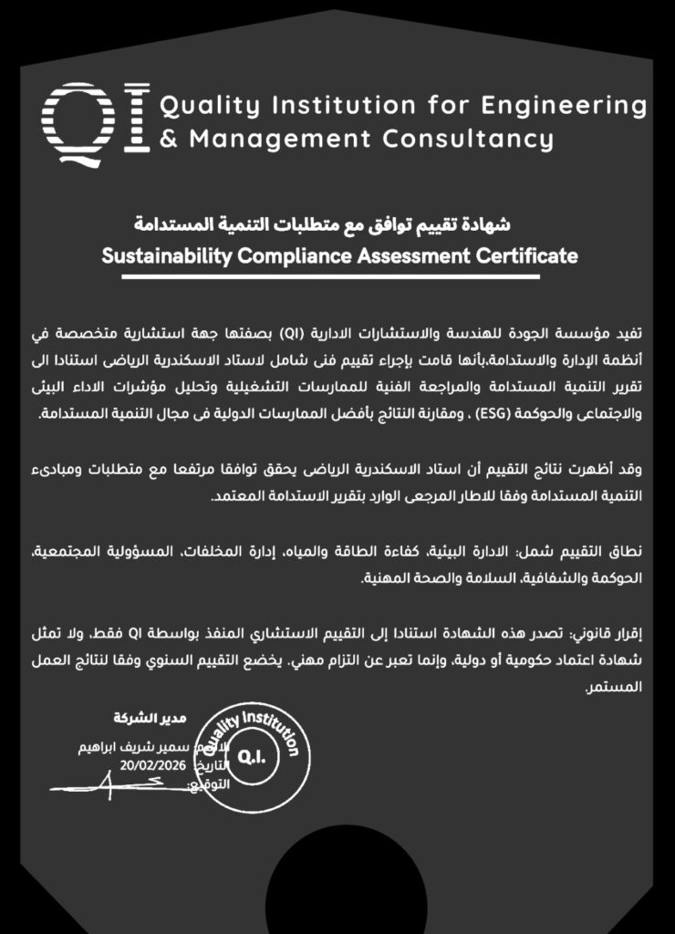 وتحت قيادة ورئاسة اللواء هشام لطفي يخطو استاد الاسكندرية خطوات واسعه نحو الرقي والعالمية فقد حقق استاد الإسكندرية الرياضي إنجازًا جديدًا يُضاف إلى سجله، بعد حصوله على شهادة تقييم التوافق مع متطلبات التنمية المستدامة، الصادرة عن مؤسسة Quality Institution for Engineering & Management Consultancy (QI)، الجهة الاستشارية المتخصصة في أنظمة الإدارة والاستدامة.
