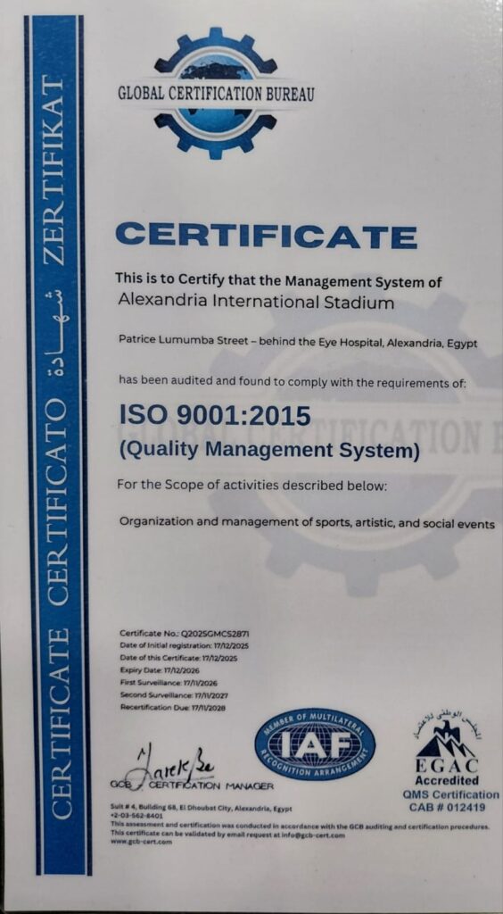 تاريخ جديد يكتبه الاستاد التاريخي بالشرق الأوسط استاد الإسكندرية بحصوله على شهادة الايزو 9001 ليكون اول استاد في افريقيا والشرق الأوسط يحصل على هذه الشهادة وهي شهادة جودة عالمية يفتخر بها أبناء مصر وتتويج لجهود الإدارة الحالية بإستاد الإسكندرية والذين يبذلون جهودغير طبيعية وتحويل الاستاد لمشهد جمالي رائع وتنظيم بطولات متعددة لجميع أبناء القطر المصري