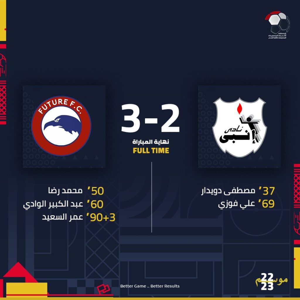 وفي الوقت بدل الضائع والجميع يعتقد ان المباراة ستنتهي بالتعادل يفاجئ جميع من بالملعب بتسجيل هدف الفوز لفيوتشر في الدقيقة 90 +5 لينتهي اللقاء بثلاثية مقابل هدفين لفيوتشر وبهذه النتيجة يتوقف رصيد انبي عند النقطة العاشرة في المركز 17 ويصعد فيوتشر للنقطة 30 في مركز الوصافة