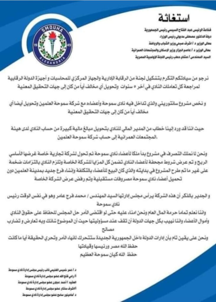 ورئيس النادي يصدر بيان مفبرك بحفظ قضيه لا تمت بصله باموال سموحه ولم يذكر فيها اي بند تخص هذا الملف من الاساس