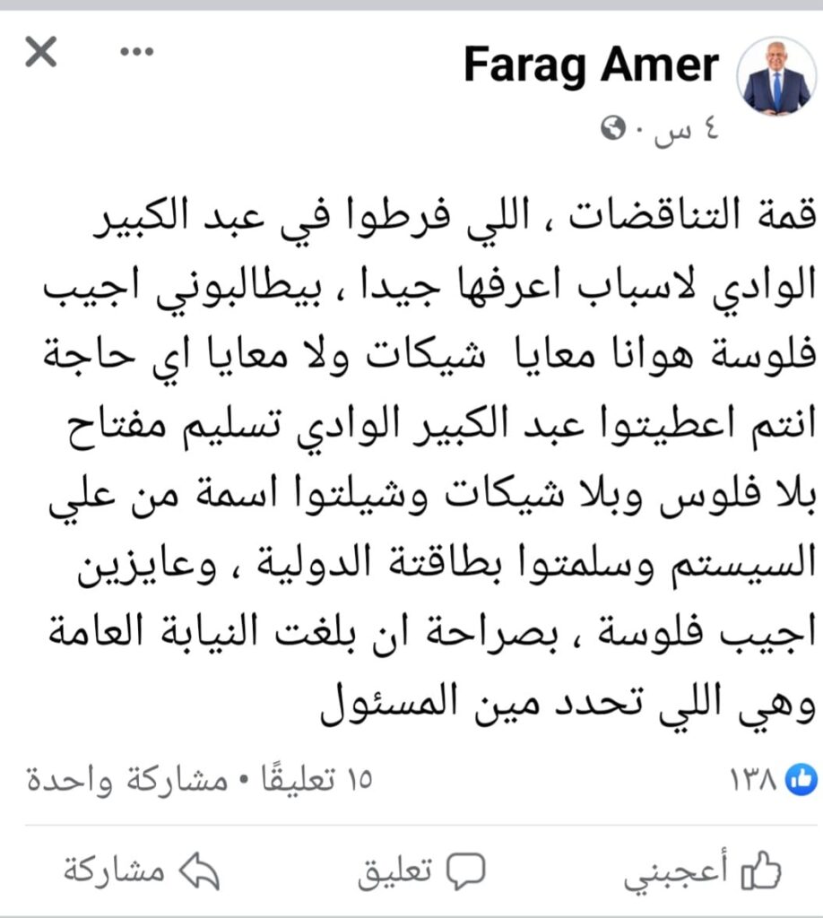قمة التناقضات ، اللي فرطوا في عبد الكبير الوادي لاسباب اعرفها جيدا ، بيطالبوني اجيب فلوسة هوانا معايا شيكات ولا معايا اي حاجة انتم اعطيتوا عبد الكبير الوادي تسليم مفتاح بلا فلوس وبلا شيكات وشيلتوا اسمة من علي السيستم وسلمتوا بطاقتة الدولية ، وعايزين اجيب فلوسة ، بصراحة ان بلغت النيابة العامة وهي اللي تحدد مين المسئول