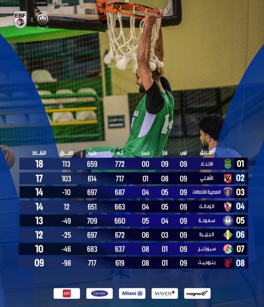 تصدر فريق كرة السلة بنادي الاتحاد السكندري ترتيب دوري أليانز الممتاز، عقب نهاية الجولة التاسعة من منافسات البطولة، بعدما جمع 18 نقطة، ليعتلي صدارة جدول الترتيب.