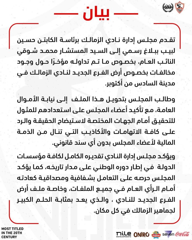 “مجلس إدارة نادي الزمالك برئاسة الكابتن حسين لبيب ببلاغ رسمي إلى السيد المستشار محمد شوقي النائب العام، بخصوص ما تم تداوله مؤخرًا حول وجود مخالفات بخصوص أرض الفرع الجديد لنادي الزمالك في مدينة السادس من أكتوبر