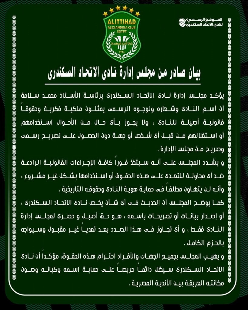 واختتم البيان بدعوة جميع الجهات والأفراد إلى ضرورة احترام حقوق النادي، مؤكدًا أن الاتحاد السكندري سيظل حريصًا على صون اسمه وكيانه ومكانته الكبيرة بين الأندية المصرية