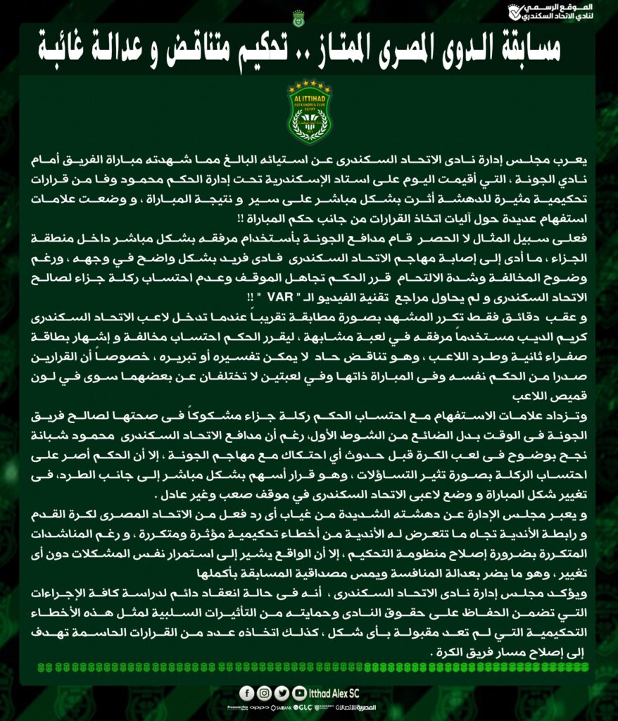 في بيان شديد اللهجة اعرب مجلس إدارة نادي الاتحاد السكندري استيائه الشديد من لجنة الحكام عامة ومن حكم لقاء مباراة الفريق امام الجونة محمود وفا والتي إنتهت بخسارة فريق الاتحاد السكندري بهدفين دون رد وفيها تغاضى الحكم عن عمد عن احتساب ضربتين جزاء للاتحاد واحتساب ضربة جزاء مشكوك في صحتها بجانب ان هناك ضربة جزاء واضحة وصريحة للاتحاد عندما تعمد لاعب الجونه دفع فادي فريد مهاجم الاتحاد بمرفقه في وجهه داخل منطقة ولم يعطي حكم اللقاء أي أهمية ولم يلتفت للعبة ولم يراجع حكام تقنية الفيديو وكان على حكم الفيديو ان يوقف الحكم ويتابع اللعبة ولكن هذا لم يحدث وبعدها بدقائق بسيطة تدخل من لاعب الاتحاد كريم الديب مع لاعب الجونه بنفس الطريقة وقام الحكم باحتساب خطأ على لاعب الاتحاد مباشرة وبطاقة صفراء ثانية وطرد للبطاقة الثانية وهدد بيان الاتحاد السكندري انه سوف يقوم باتخاذ إجراءات لكي تتحقق العدالة وللحفاظ على حقوق النادي وجاء بعنوان تحكيم متناقض وعدالة غائبة وجاء في البيان البيان كالتالي :