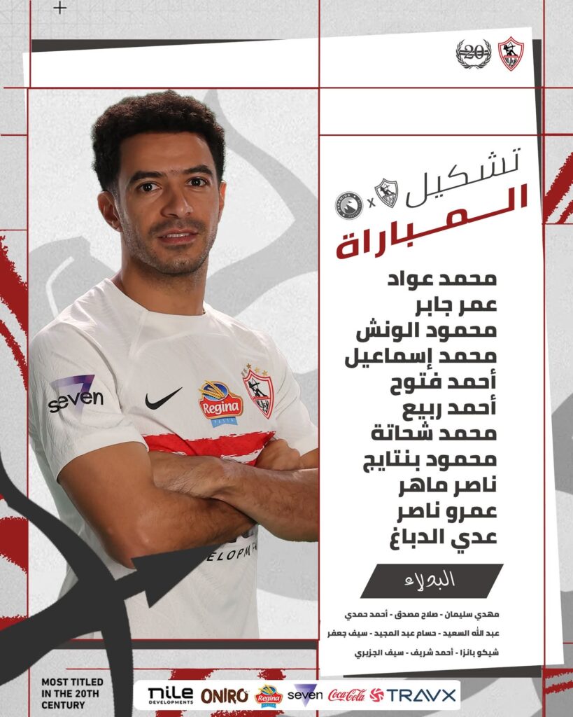 ويتواجد على مقاعد البدلاء، مهدي سليمان وحسام عبد المجيد وصلاح مصدق وسيف جعفر وعبد الله السعيد وأحمد حمدي وشيكو بانزا وأحمد شريف وسيف الجزيري.