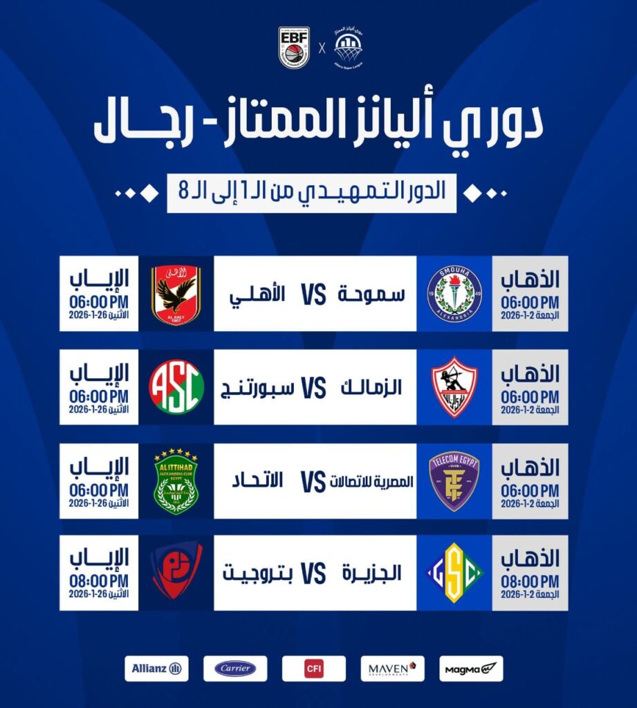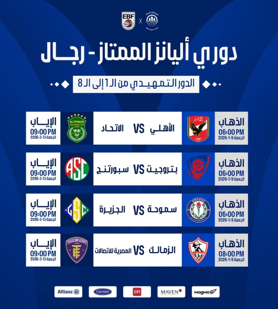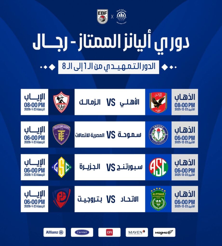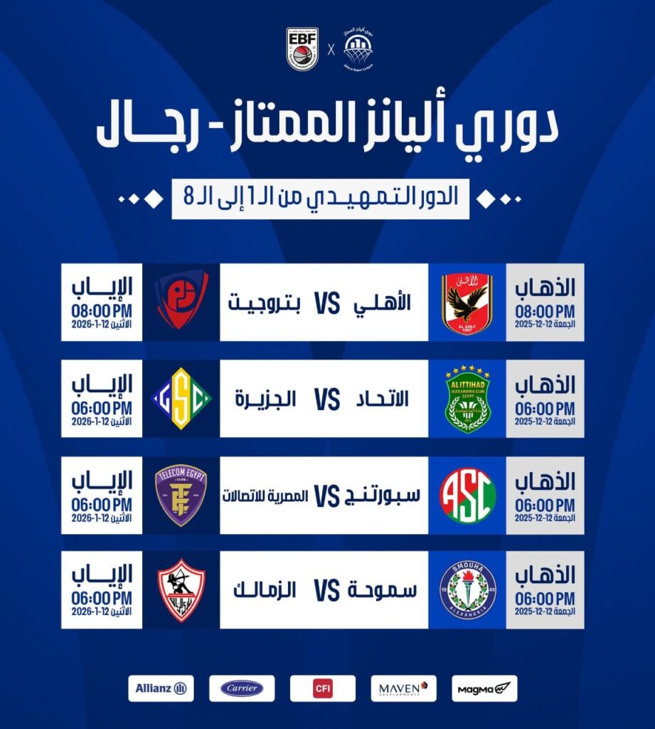 ويقام الدور التمهيدي لبطولة كرة السلة من 8 جولات، تقام مباريات الجولة الأولى يوم 12 ديسمبر ومباريات العودة 12 يناير وفيما يلي الجدول الكامل لمنافسات دورى أليانز الممتاز لكرة السلة: