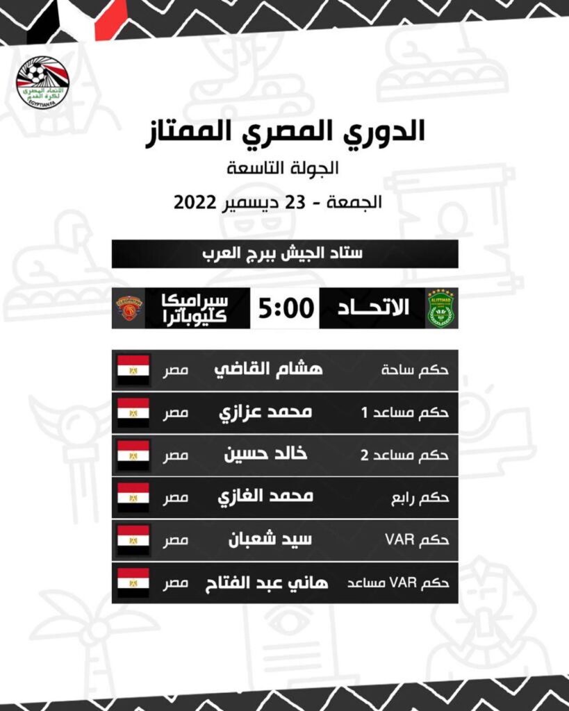 أعلن اتحاد الكرة عن تعيين الحكم هشام القاضي حكمًا لمباراة سيراميكا كليوباترا والاتحاد السكندري، ويعاونه على تقنية الفيديو سيد شعبان