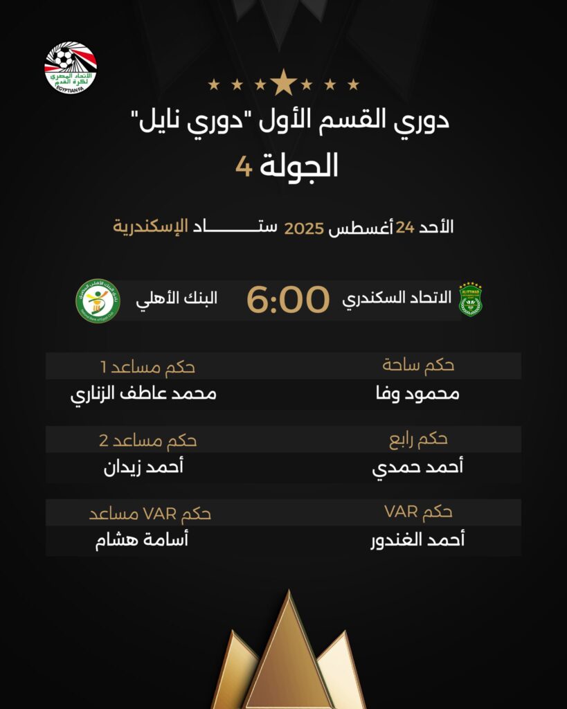 أعلنت لجنة الحكام باتحاد كرة القدم المصري عن حكام لقاء الاتحاد السكندري والبنك الأهلي والتي ستقام يوم الأحد القادم في تمام الساعة السادسة مساءا ويستقبلها استاد الإسكندرية الدولي وجاء طاقم التحكيم كالتالي :