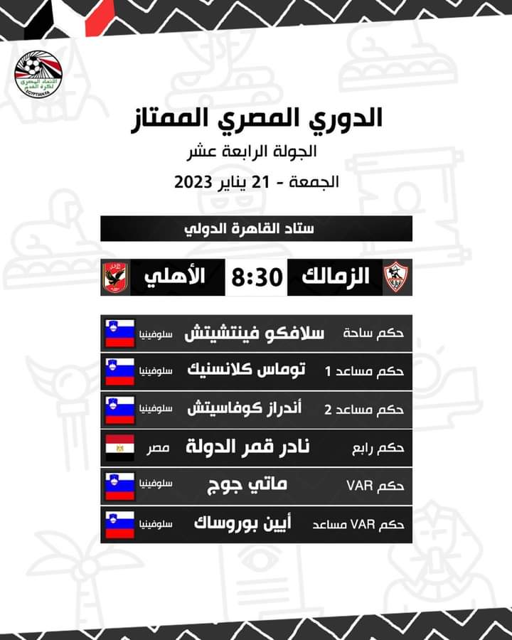 اعلن اتحاد كرة القدم المصري عن حكام اللقاء المرتقب لكلاسيكو الكرة المصرية ولقاء القطبين الأهلي والزمالك وذلك ضمن لقاءات الجولة الرابعة عشر بالدوري المصري والمقرر له يوم السبت القادم