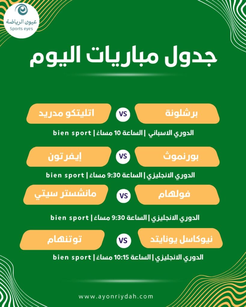 تقدم ” عيون الرياضة 👀 ” مواعيد مباريات اليوم، الثلاثاء.حيث تستمر منافسات كأس العرب بجانب الدوريين الإنجليزي والإسباني.
