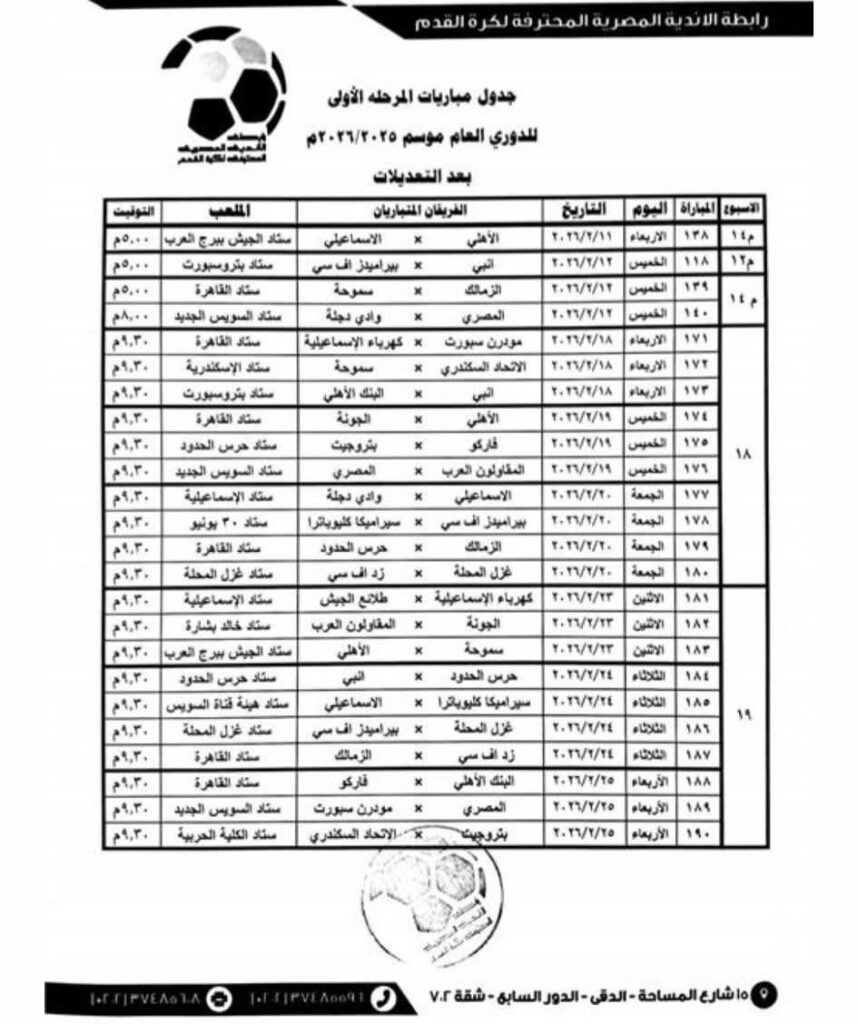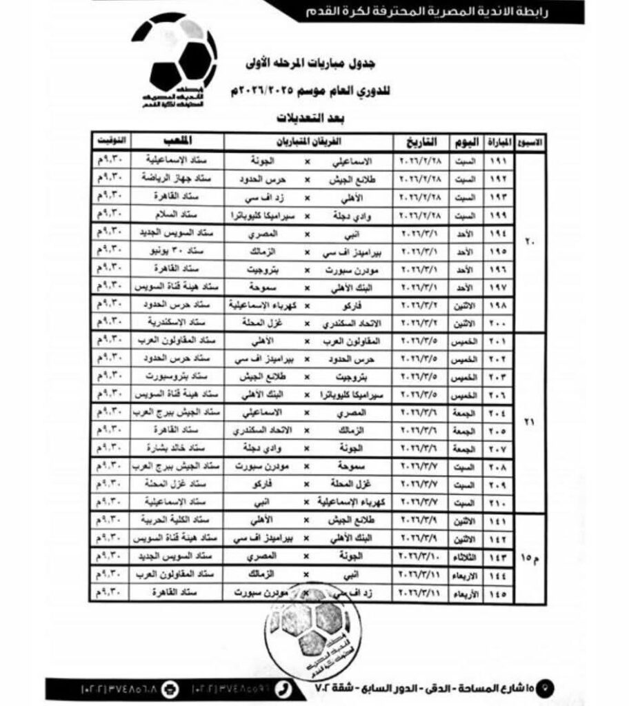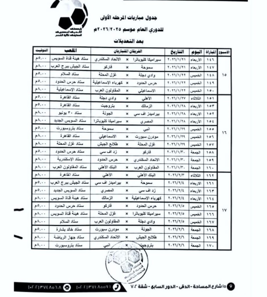 وننشر لكم جدول مباريات بطولة الدورى المصرى الممتاز عقب تعديل رابطة الأندية المحترفة :