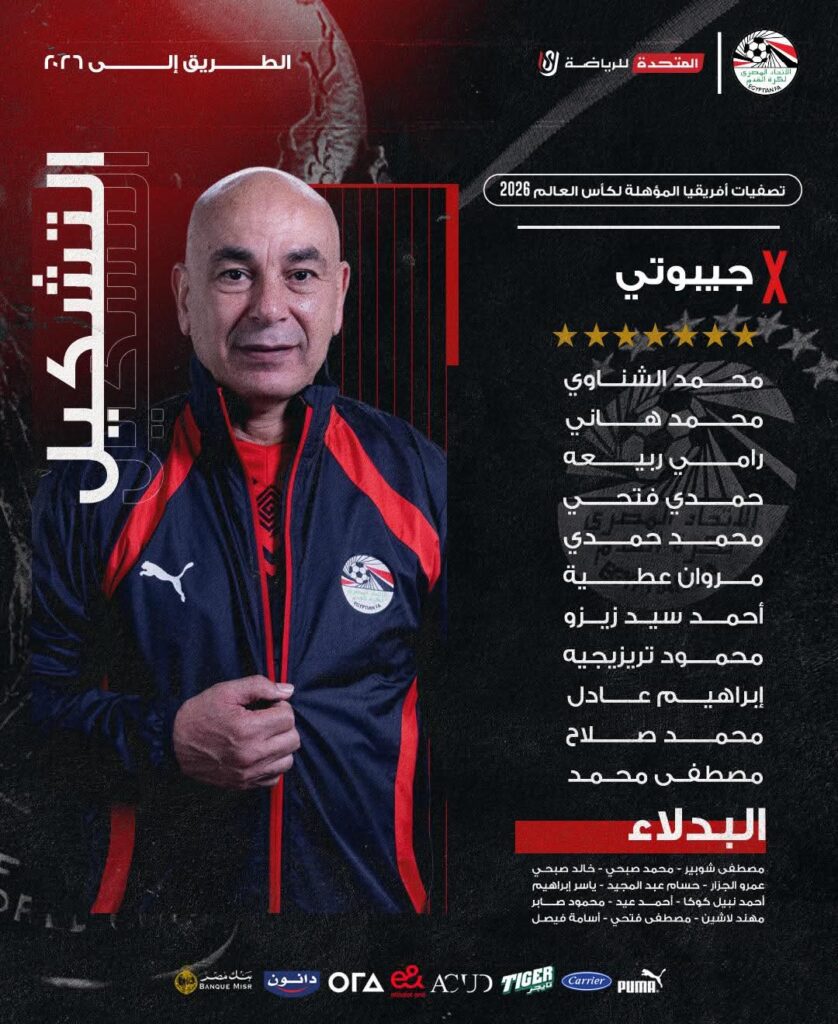 أعلن الكابتن حسام حسن المدير الفني لمنتخب مصر الأول لكرة القدم تشكيل المنتخب في مواجهة جيبوتي المقرر لها السابعة مساء اليوم الإربعاء – بتوقيت القاهرة – ضمن مواجهات الجولة التاسعة من التصفيات الأفريقية المؤهلة لنهائيات كأس العالم ٢٠٢٦ وجاء كالتالي :