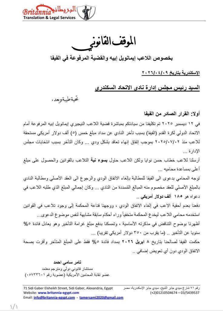وننشر لكم ايضا موقف الاتحاد السكندري القانوني من قضية اخرى للاعب ايمانويل ايبييه تم الانتهاء منها بالامس لخلرة وحمكة ادارة شئون اللاعبين ومجهود كبير من المستشار القانوني تامر سامي