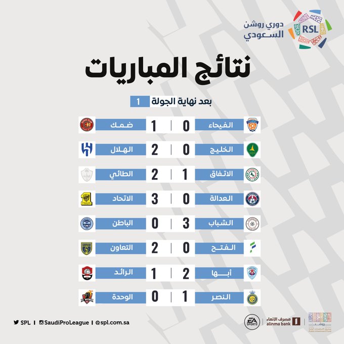 حيث فاز الهلال على الخليج  بهدفين دون رد – والاتحاد على العدالة بثلاثية نظيفة – والنصر على الوحدة بهدف دون رد