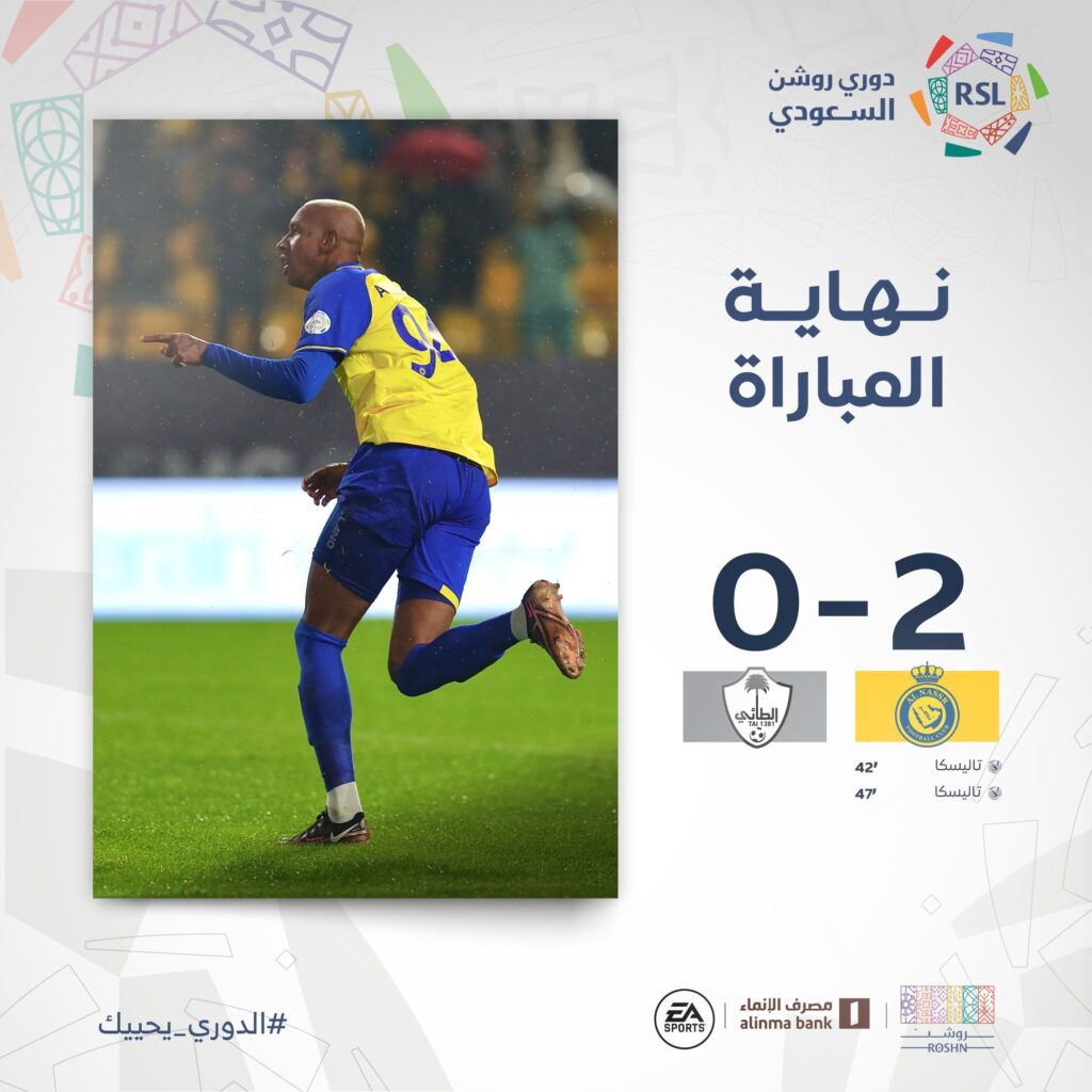 حقق النصر الفوز بهدفين دون رد على نظيره الطائي في تواجد كريستيانو رونالد بمدرجات ملعب مرسول بارك