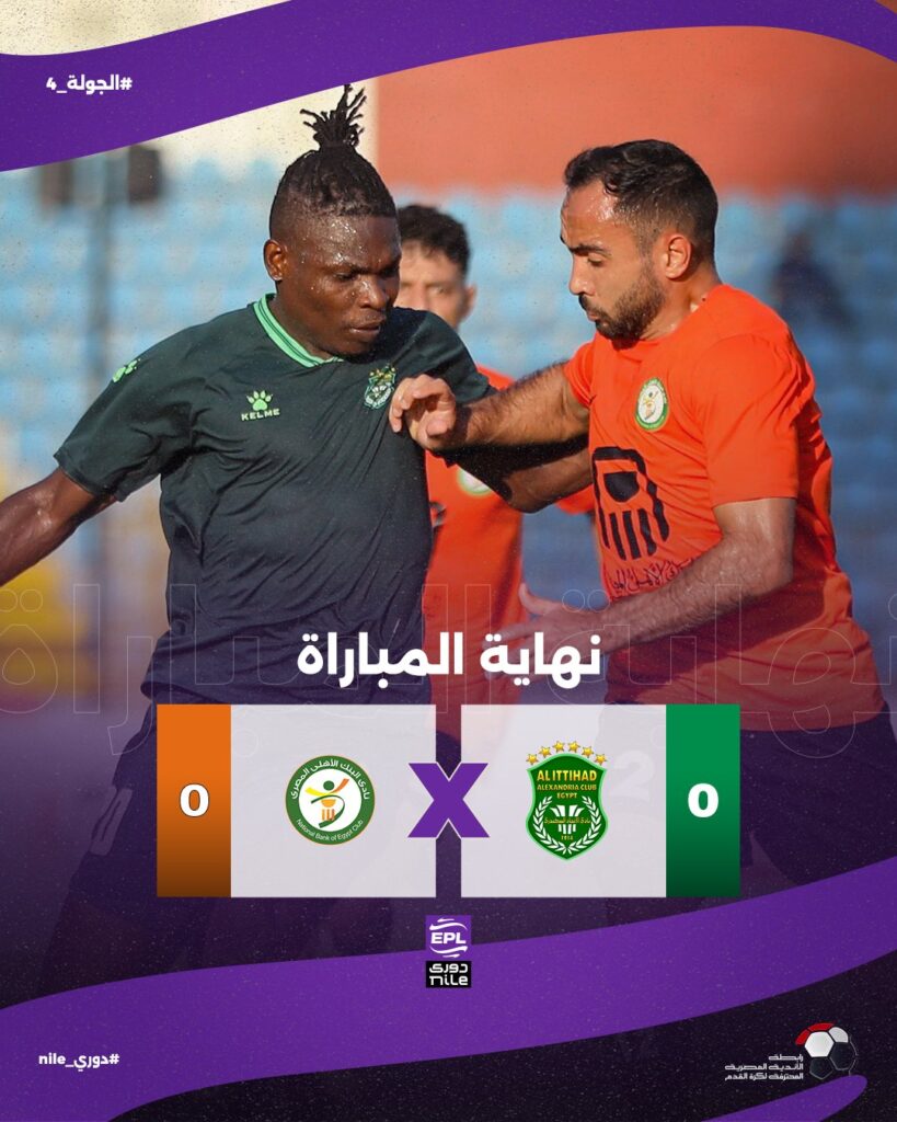 حسم التعادل السلبي نتيجة لقاء الاتحاد السكندري والبنك الأهلي وذلك خلال لقاء الفريقين ضمن الجولة الرابعة بدوري “نايل” والذي استضافه استاد الإسكندرية وبقيادة تحكيمية لمحمود وفا بداية حذرة من الفريقين واللعب انحصر في وسط الملعب مع تسديدة متوسطة من أبو بكر ليادي ومحاولة تسديد لجون ايبوكا وهجمات مرتدة سريعة للبنك الأهلي ولكن تنتهي على اقدام لاعبو الاتحاد وركنيات ومحاولات من أسامة فيصل وياو أنور وفي الدقيقة 45 يسدد أسامة فيصل كرةمباشرةويتصدى صبحي سليمان ببراعة لركنية وضربة جزاء للاتحاد لم يحتسبها الحكم ولا تقنية الفيديو لينتهي شوط اللقاء الأول بالتعادل السلبي بين الفريقين .