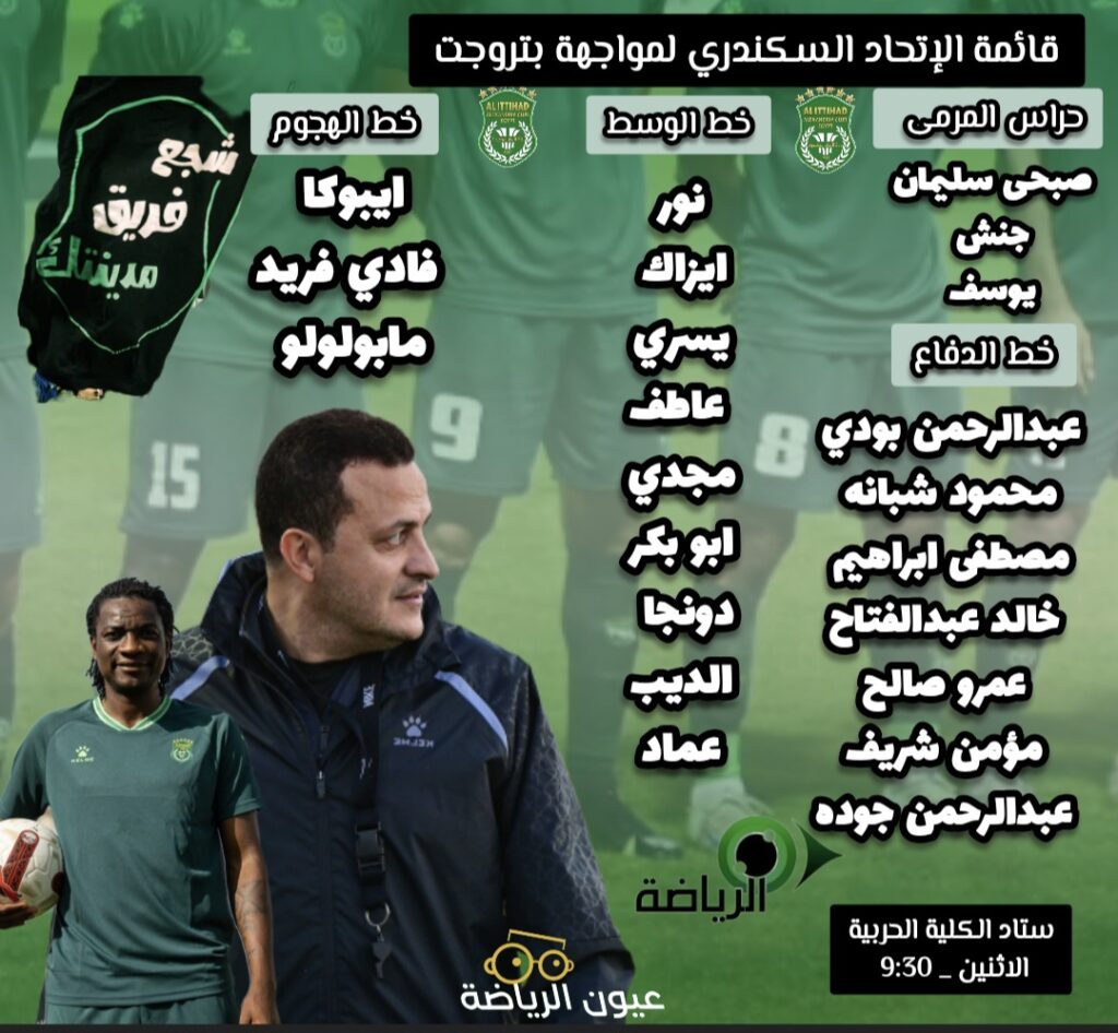 استقر “تامر مصطفى ” المدير الفني للفريق الأول لكرة القدم بنادي الاتحاد السكندري على قائمة الفريق في مباراته امام بتروجت ضمن منافسات الجولة التاسعة عشرة من بطولة الدوري الممتاز، غدًا الأربعاء، على استاد الكلية الحربية في تمام الساعة التاسعة والنصف مساءً والتي جاءت كالتالي :