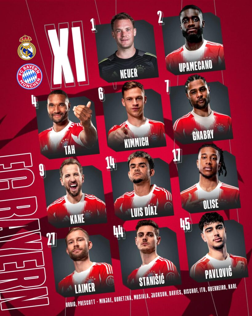 على الجانب الآخر، دخل البايرن المباراة بحارس الأسطورة مانويل نوير، وفي الدفاع تواجد أوباميكانو وجوناثان تاه وأيضًا جوشوا كيميتش الذي لعب كقلب دفاع أحيانًا. أما خط الوسط فشهد تواجد جنابري ولايمر وستانسيتش وبافلوفيتش، بينما قاد هاري كين هجوم الفريق البافاري بجانب لويس دياز ومايكل أوليس في ثلاثي هجومي متكامل.