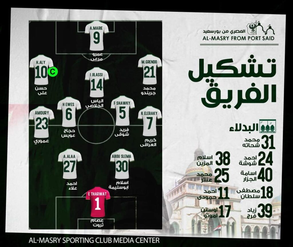 اعلن المدير الفني للنادي المصري حسام حسن تشكيل الفريق امام نادي فاركو في لقاء الجولة 24 بالدوري المصري الممتاز وجاء التشكيل كالتالي :