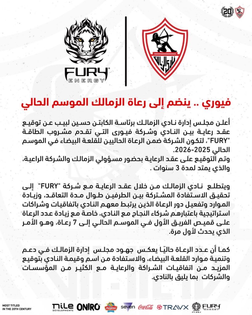 أعلن مجلس إدارة نادي الزمالك برئاسة الكابتن حسين لبيب عن توقيع عقد رعاية بين النادي وشركة فيورى التي تقدم مشروب الطاقة “Fury”، لتكون الشركة ضمن الرعاة الحاليين للقلعة البيضاء في الموسم الحالي 2025-2026.