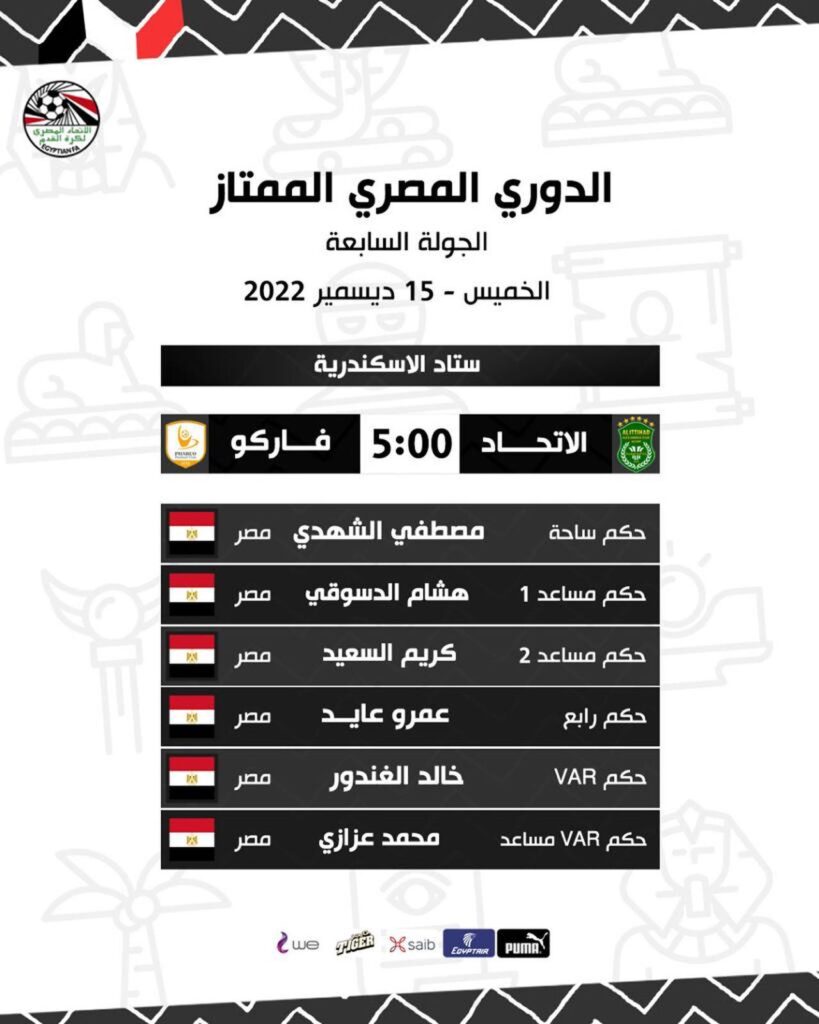 واختارت لجنة الحكام المصرية التابعة لاتحاد كرة القدم المصري حكام لقاء مباراة الاتحاد السكندري وفاركو ضمن الجولة السابعة بالدوري المصري الممتاز المقرر اقامتها غدا الخميس في تمام الساعة الخامسة بتوقيت القاهرة السادسة بتوقيت مكة المكرمة على ارض ملعب ستاد الإسكندرية .