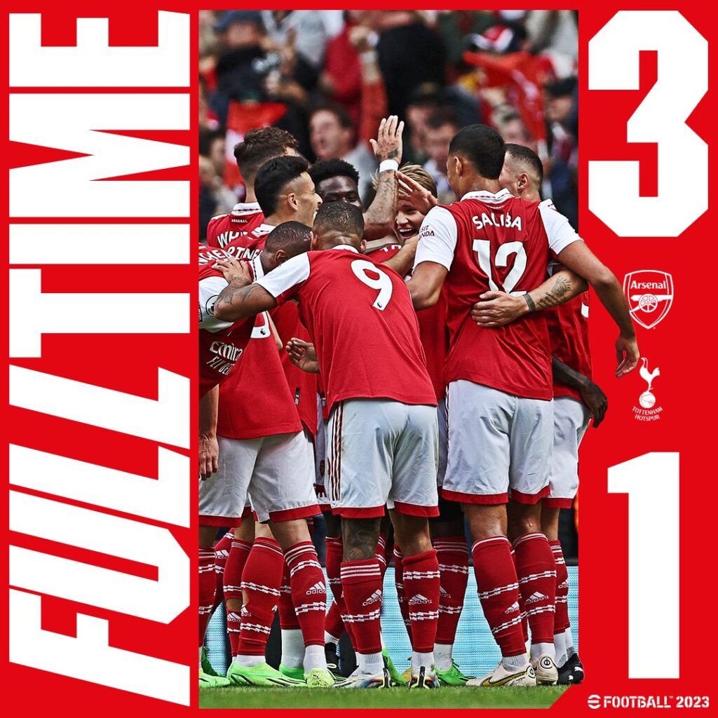 فى الشوط الثانى ضغط ارسنال لإحراز تقدما مبكرا و بالفعل نجح المتألق جبريال جيسوس فى إحراز هدف ارسنال الثانى فى الدقيقة ٤٩ و ظلت المبارة حافلة بالندية و الإثارة حتى جائت نقطة التحول فى الدقيقة ٦٢ حيث تلقى اللاعب البرازيلى ايميرسون لاعب توتنهام الكارت الاحمر لتهوره ضد مواطنه البرازيلى مارتينيلى لاعب ارسنال ليلعب توتنهام منقوصا من أحد أهم لاعبى الوسط فى الفريق , ليسيطر ارسنال بالطول و العرض و يحرز الهدف الثالث عن طريق تشاكا فى الدقيقة ٦٧فى ملحمة كروية مميزة من أرسنال , ليستمر ارسنال فى الضغط وسط حالة توهان و عدم اتزان من لاعبى توتنهام الذين فقدوا الثقة تماما و لم يحاولوا حتى أن يردوا الفعل , لينتهي اللقاء بفوز الجانرز على السبيرز و يؤكدون تربعهم على القمة برصيد ٢١ نقطة