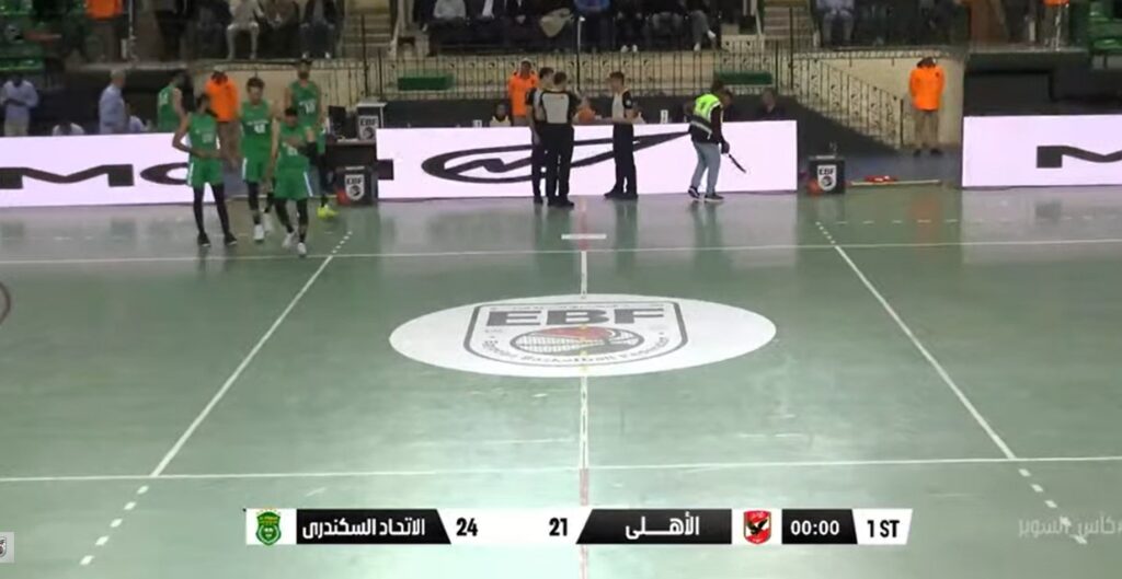 بداية للأهلي بثلاثية لرامي إبراهيم وتعادل اول 24 -24 في اللقاء ويتقدم الأهلي بنتيجة 29-26 وتعادل ثاني 29-29 ويتقدم الأهلي بنتيجة 42-40 ويعود للتقدم 50 -46