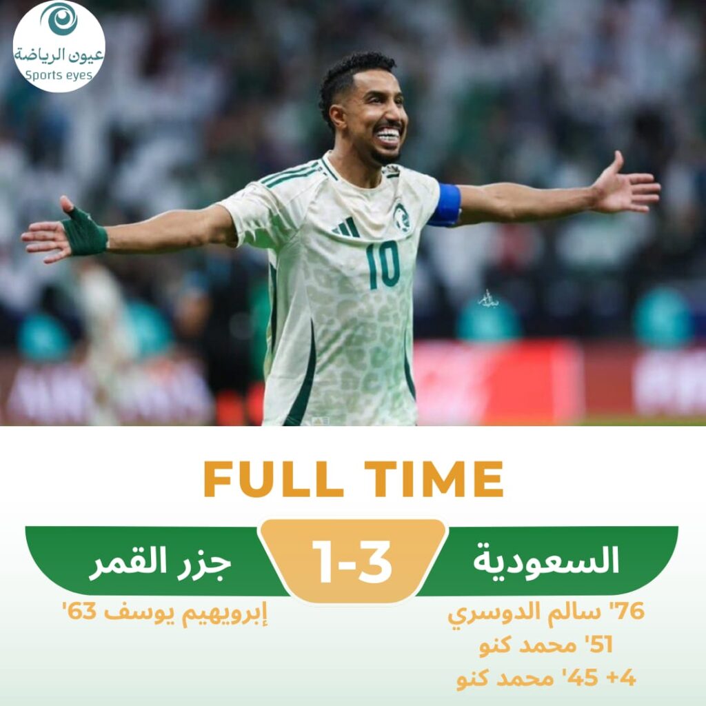حقق المنتخب السعودي، فوزا كبيرا  على جزر القمر، بثلاثة أهداف مقابل هدف، مساء اليوم الجمعة، في الجولة الثانية لدور المجموعات ببطولة كأس العرب. أحرز أهداف السعودية محمد كنو هدفين في الدقيقتين 45+4 و51 وسالم الدوسري في الدقيقة 76، في حين سجل هدف جزر القمر إبراهيم يوسف في الدقيقة 63.