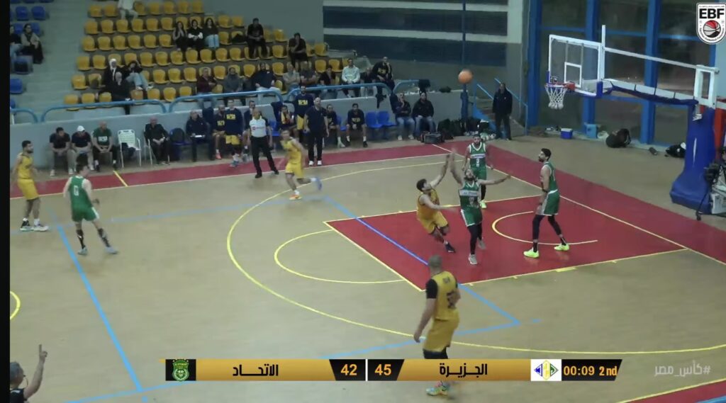 تبادل تسجيل من الفريقين وتوفيق كبير في ثلاثيات الجزيرة وتصل النتيجة لصالح الجزيرة ٣٥-٢١ ويضيف الفارق لنتيجة ٤٠- ٣٨ وتعادل اول في اللقاء 40-40 ويعود الجزيرة للتقدم 45-40 وتنتهي الفترة الثانية بنتيجة