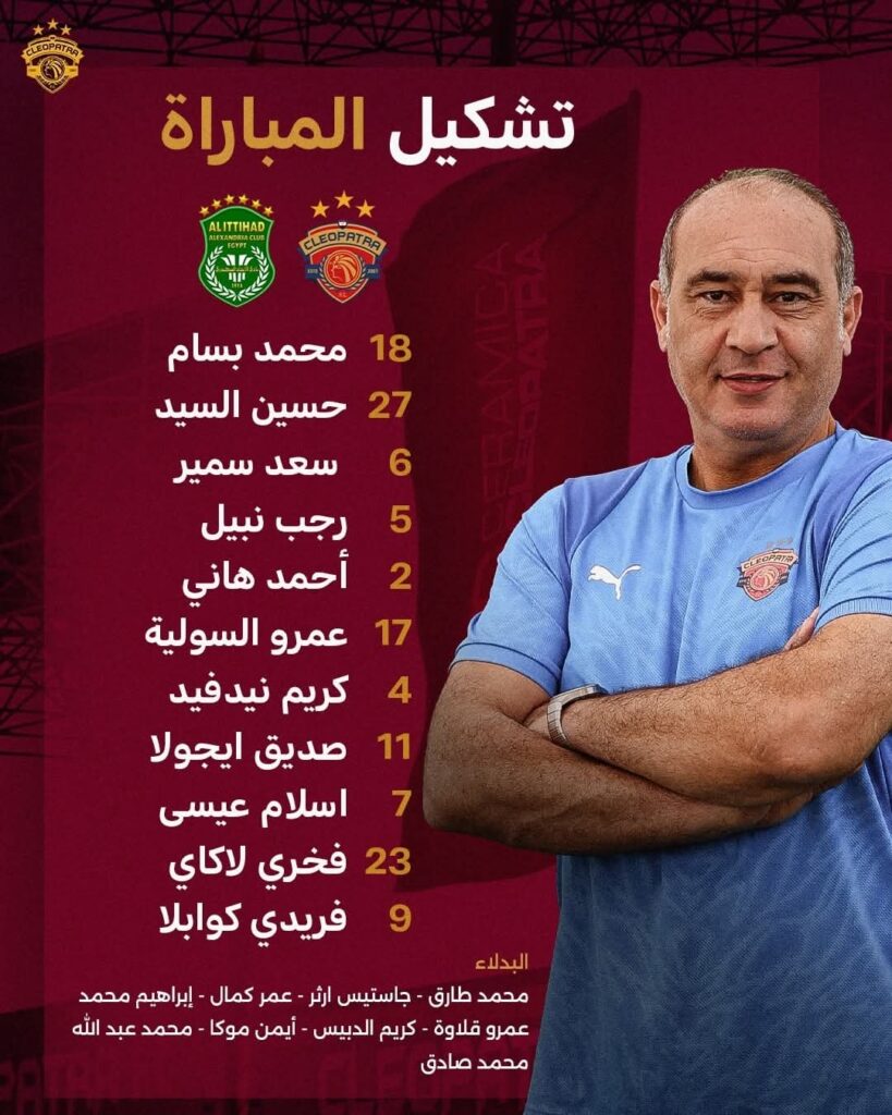 أعلن الجهاز الفني لفريق سيراميكا كليوباترا بقيادة الكابتن علي ماهر ، تشكيل الفريق لمواجهة الاتحاد السكندري في الجولة ال15 من بطولة الدوري العام. .