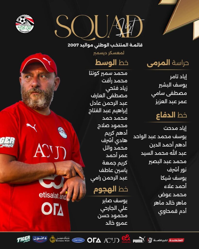 أعلن وائل رياض، المدير الفني لمنتخب مصر للشباب مواليد 2007، قائمة اللاعبين المختارين للمعسكر الذي ينطلق غدآ (الأربعاء) ويستمر حتى الثامن عشر من ديسمبر الجاري ويتخلله مباريات تحريبية مع اندية في الدوري الممتاز ودوري المحترفين في إطار الاستعداد للاستحقاقات القادمة.